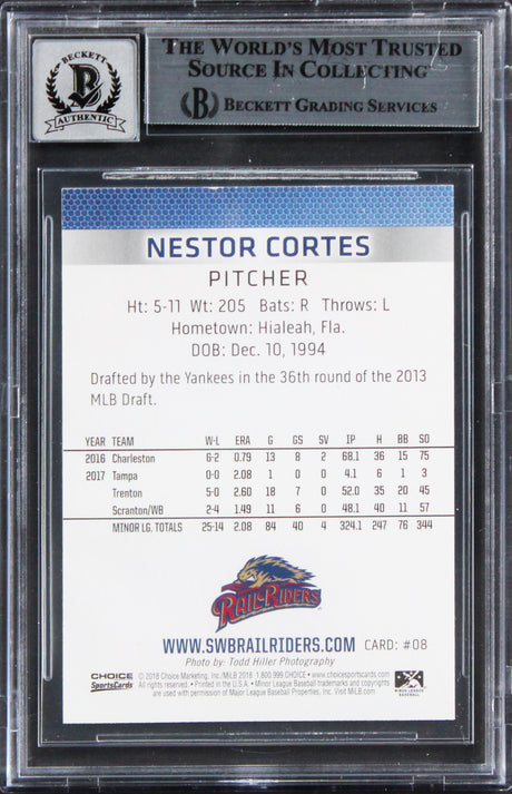 Very low stock (1 unit)$59Unit price /UnavailableYankees Nestor Cortes Signed 2018 Scranton/WB Rail #8 RC Card Auto 10! BAS Slab