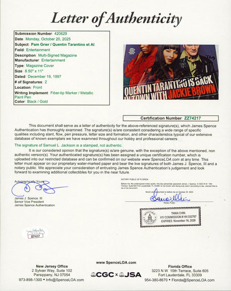 Quentin Tarantino & Pam Grier Jackie Brown Signed Magazine Cover JSA #ZZ74217