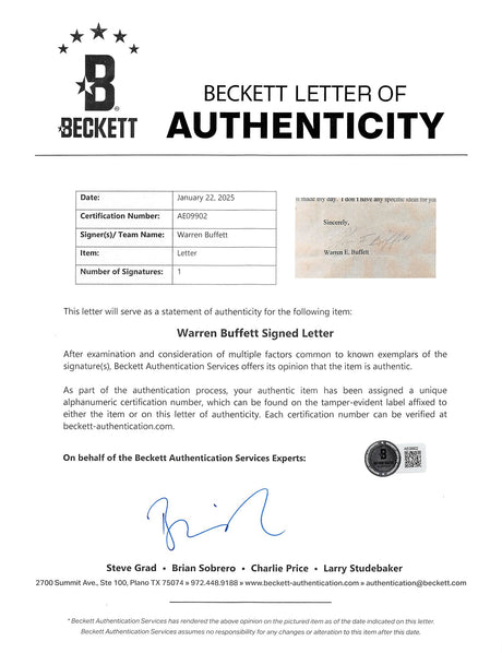 Warren Buffett Signed 8.5x11 Framed Letter On Berkshire Hathaway Letterhead BAS