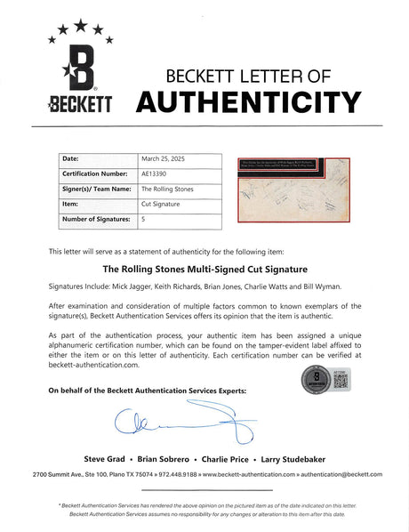 Rolling Stones (5) Jagger, Richards, Wyman +2 Signed & Framed 7x11 Cut BAS LOA