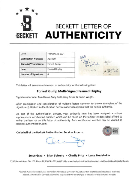 Forrest Gump (4) Hanks, Sinise, Field, Wright Signed Framed Display BAS #AD38611