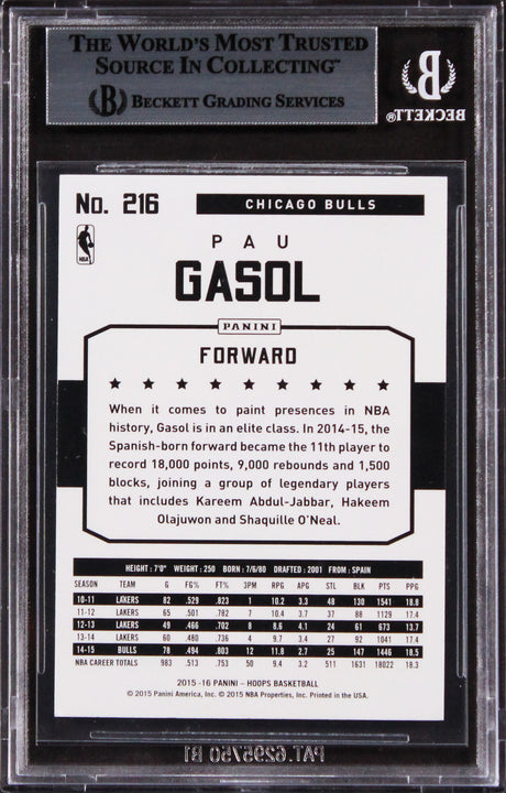 Very low stock (1 unit)$459Unit price /Unavailable Bulls Pau Gasol Authentic Signed 2015 Hoops #216 Card Autographed BAS Slabbed