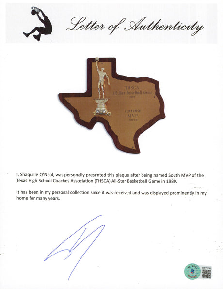 Lakers Shaquille O'Neal 1989 THSCA All-Star Basketball Game MVP Plaque BAS Wit