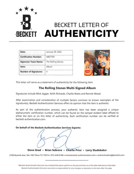 Rolling Stones (4) Jagger, Richards, Wood +1 Signed Album Cover BAS #AB07769
