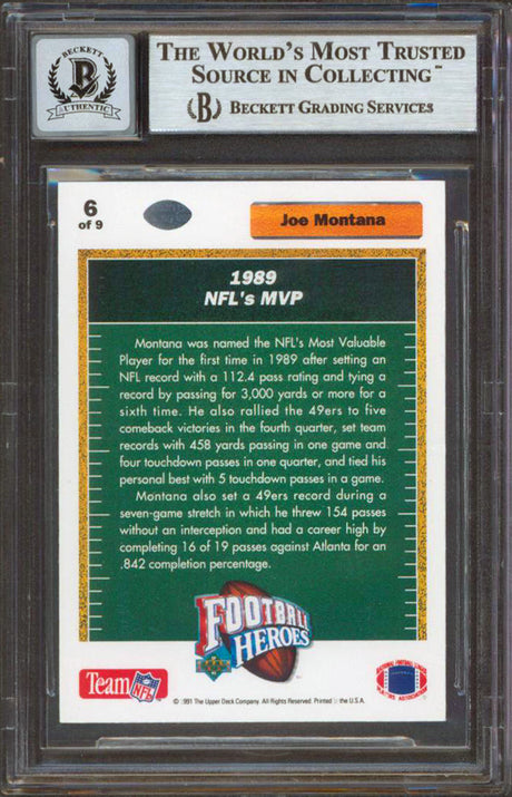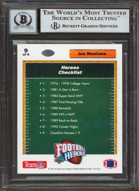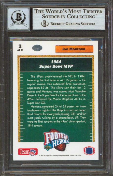 49ers Joe Montana Signed 1991 Upper Deck Heroes #9 Card Auto Graded 10! BAS Slab
