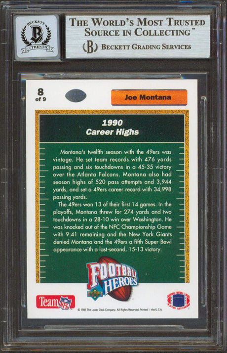 49ers Joe Montana Signed 1991 Upper Deck Heroes #8 Card Auto Graded 10! BAS Slab