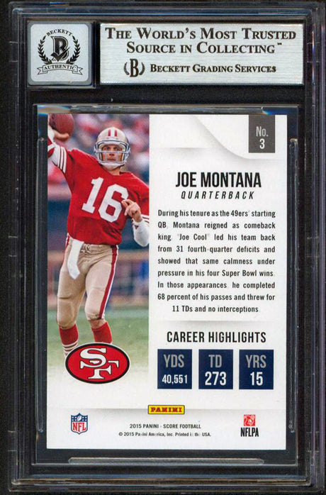 49ers Joe Montana Signed 2015 Score #3 Card Auto Graded Gem Mint 10! BAS Slabbed