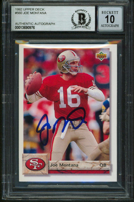 49ers Joe Montana Signed 1992 Upper Deck #560 Card Auto Graded 10! BAS Slabbed