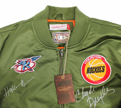 Rockets Hakeem Olajuwon & Clyde Drexler Signed Green M&N Bomber Jacket BAS Wit