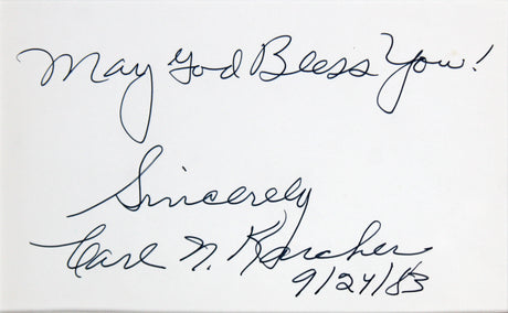 Carl Karcher Carl's Jr. Authentic Signed 4x6.25 Cut Signature BAS #AE09336