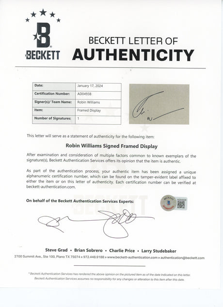 Robin Williams & Sally Field Mrs. Doubtfire Signed Framed Display BAS & PSA