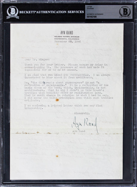 Ayn Rand Authentic Signed 7.25x10 Typed Letter Dated Nov. 29, 1946 BAS Slabbed