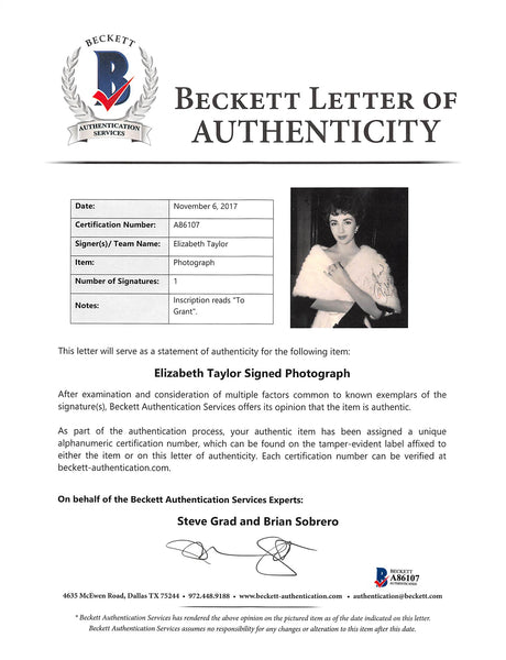 Elizabeth Taylor "To Grant" Authentic Signed 8x10 Vintage B&W Photo BAS #A86107