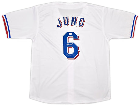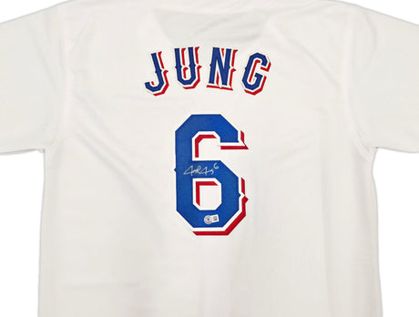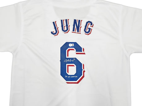 Texas Rangers Josh Jung Autographed White Jersey Beckett BAS Witness Stock #253565
