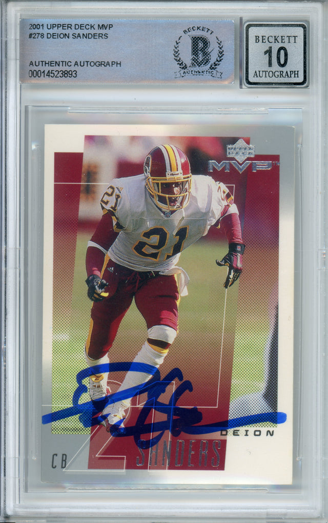 Own a piece of football and collectible history with this 2001 Upper Deck MVP #278 Deion Sanders sports trading card, featuring an authentic hand-signed autograph from the legendary Deion Sanders. This rare card captures Sanders during his time with the Washington Commanders and has been professionally authenticated and graded by Beckett Grading Services (BGS) with a perfect Autograph 10.