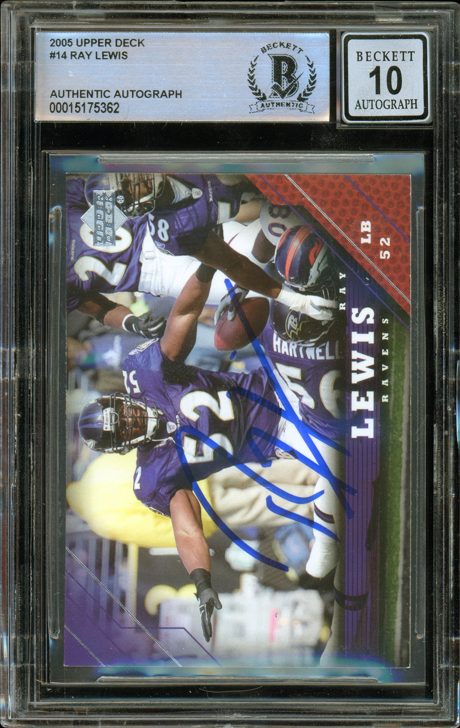 Own a piece of football history with this 2005 Upper Deck #14 Ray Lewis Baltimore Ravens BAS Autograph 10 sports trading card. This highly coveted collectible features the hand-signed autograph of Ray Lewis, one of the most dominant linebackers in NFL history, and has been professionally authenticated and graded by Beckett Grading Services (BGS).