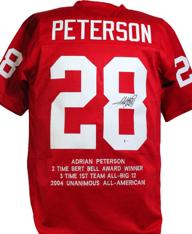Own a piece of football history with this Adrian Peterson Autographed Maroon College Style STAT Jersey, a must-have for Oklahoma Sooners fans and memorabilia collectors. This custom-made, authentic-style jersey features stitched letters and numbers, replicating the look of a classic Sooners jersey. Please note, this is not an NCAA-licensed jersey—it has no logos, tags, or emblems.