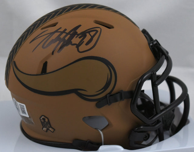 Own a piece of football history with this Adrian Peterson Minnesota Vikings autographed Riddell Salute to Service Speed Mini Helmet. One of the greatest running backs in NFL history, Peterson made an indelible mark with the Vikings, known for his explosive speed and powerful running style. This mini helmet honors the league’s Salute to Service initiative, making it a meaningful keepsake for both collectors and football fans.