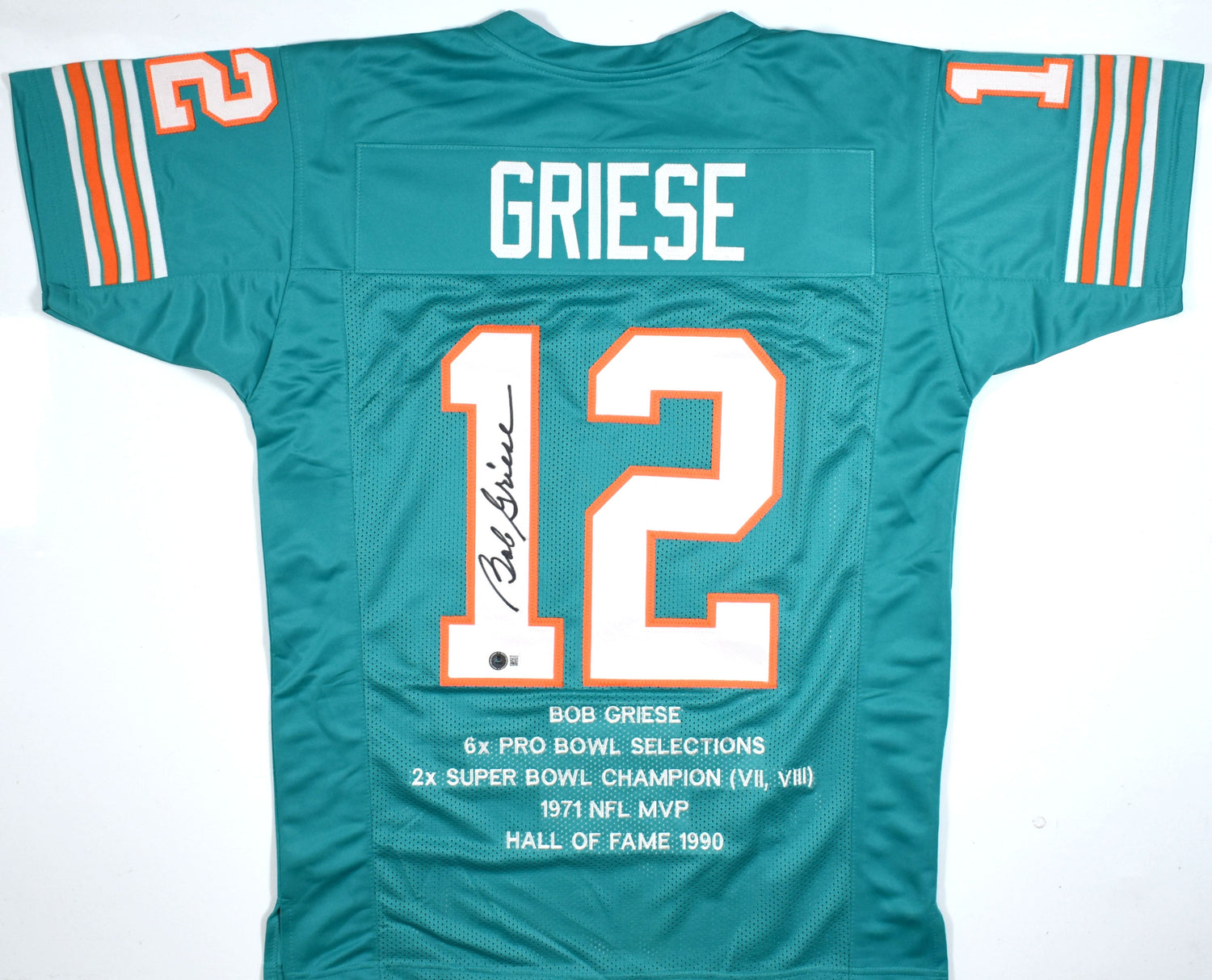 - Hand-signed by Bob Griese – Miami Dolphins Hall of Fame quarterback and two-time Super Bowl Champion.
