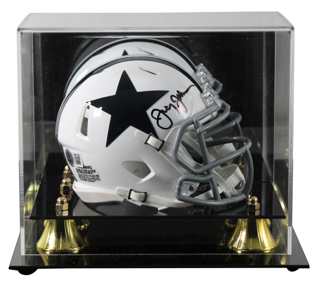Celebrate the legacy of an NFL icon with this Jimmy Johnson Autographed 1960-63 Throwback Speed Mini Helmet, complete with a UV Mirrored Back Acrylic Display Case—a striking tribute to one of the most respected coaches in Dallas Cowboys history. Whether you're a lifelong Cowboys fan or a serious collector of signed sports memorabilia, this officially authenticated piece is sure to elevate your collection. Relive the golden era of the Dallas Cowboys with this classic mini helmet design, inspired by the team's look from 1960-63. Jimmy Johnson, a Hall of Fame coach who led the Cowboys to back-to-back Super Bowl victories in the early '90s, has personally signed this collectible. His autograph, bold and unmistakable, turns this mini helmet into a true collector's treasure. This item has been authenticated through the Beckett Authentication Services (BAS) Witnessed Protection Program, meaning a BAS representative was present at the time of signing. A Beckett authentication sticker, featuring a scannable QR code, is affixed directly to the item for instant certificate-free verification.