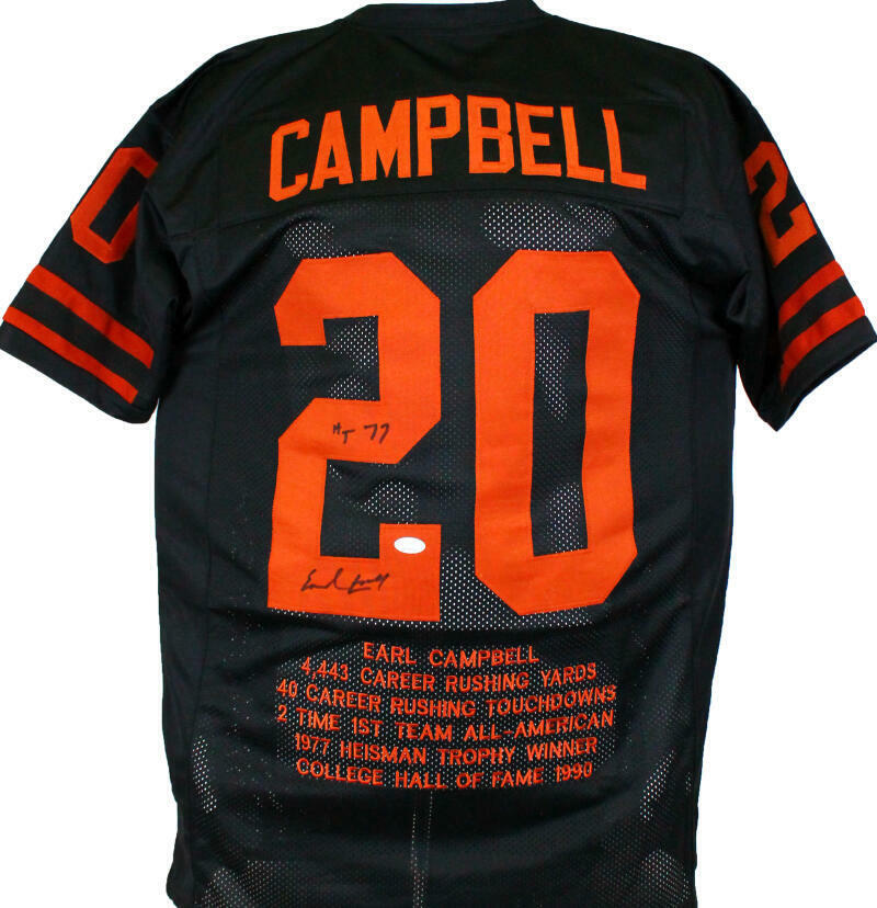 Earl Campbell Autographed Black College STAT Style Jersey w/HT - JSA W *Black is backordered and will ship as soon as it is back in stock.