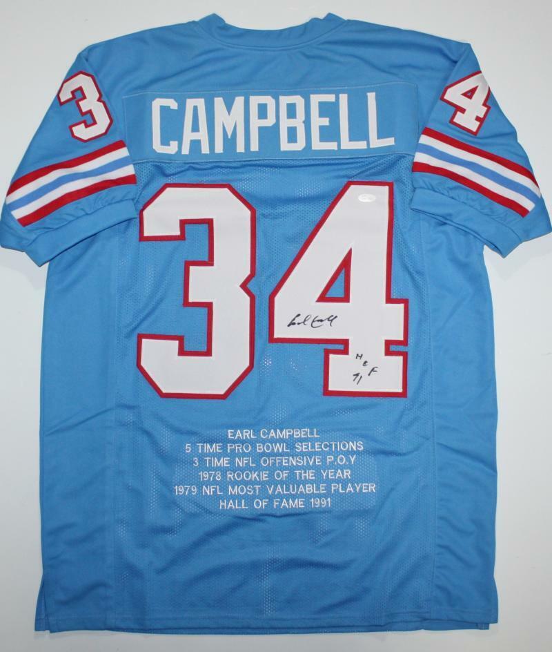 Earl Campbell Autographed Blue Pro Style Stat1 Jersey With HOF- JSA W *Black is backordered and will ship as soon as it is back in stock.