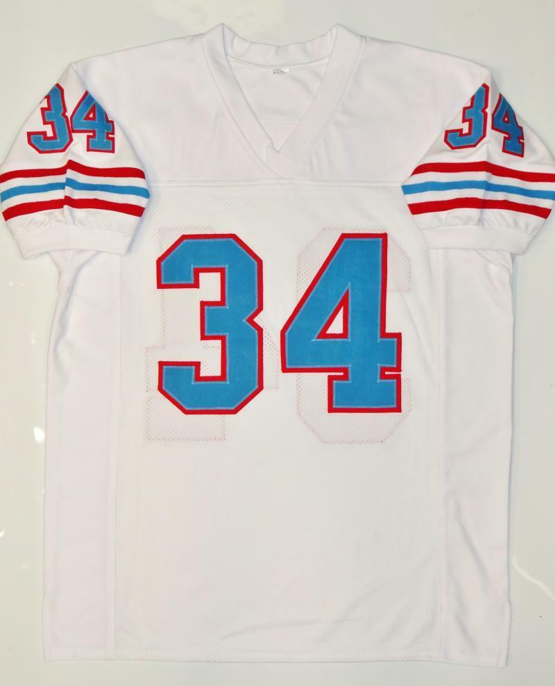 Own a piece of football history with this Earl Campbell hand-signed custom jersey, celebrating the legendary career of the Houston Oilers Hall of Famer. This jersey is not an officially licensed NFL product—it is a custom-made authentic style jersey featuring stitched letters and numbers, making it a perfect display piece for collectors and fans.