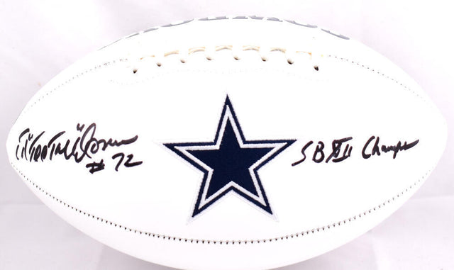 Own a piece of Dallas Cowboys history with this hand-signed Ed "Too Tall" Jones logo football, featuring the special "SB Champs" inscription. A legendary defensive end, Jones played a key role in the Cowboys' dominance, helping secure their Super Bowl XII victory. This collectible is a must-have for devoted Cowboys fans and serious memorabilia collectors.