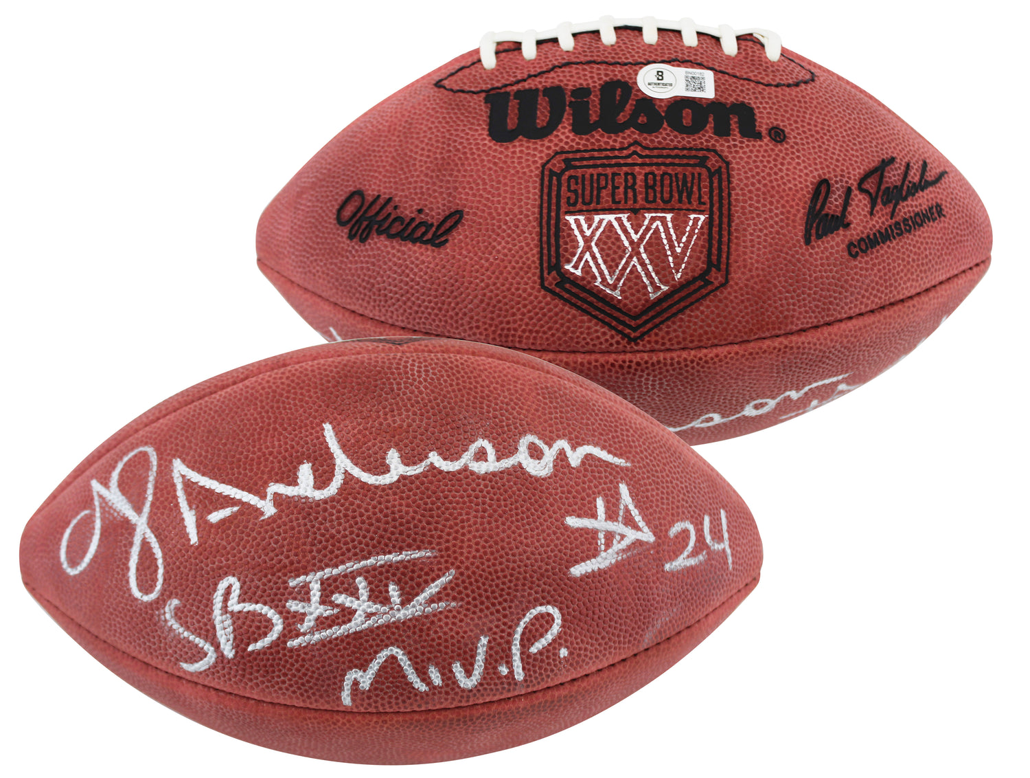 Own a piece of Super Bowl history with this Autographed Official Wilson Super Bowl XXV Logo NFL Football, personally signed by Ottis Anderson of the New York Giants. This exclusive collectible also features the inscription "SB XXV MVP," commemorating Anderson’s unforgettable performance in Super Bowl XXV, where he was named Super Bowl MVP after leading the Giants to victory.