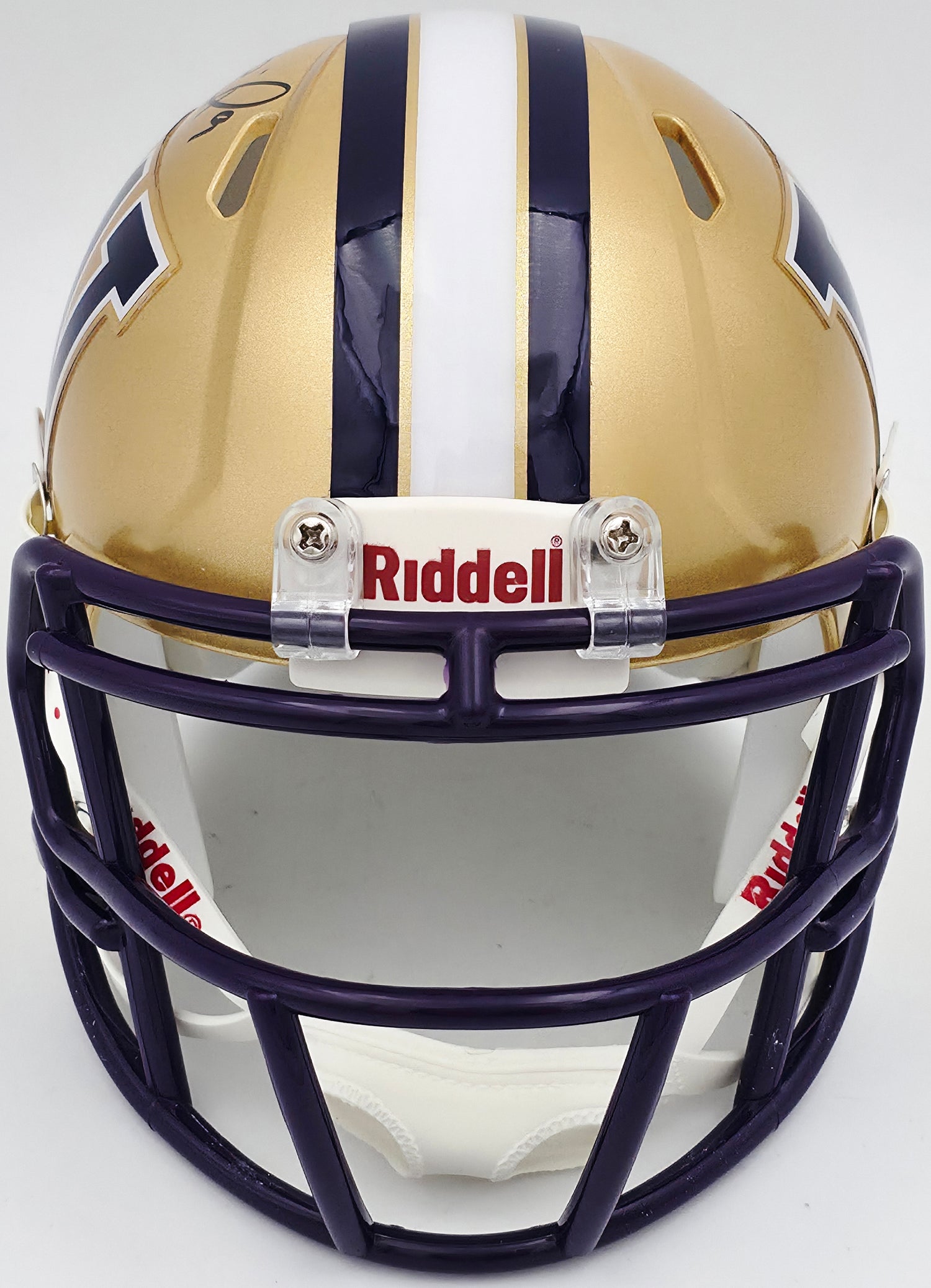 Celebrate the electrifying college football rise of the Washington Huskies with this stunning Washington Huskies Gold Speed Mini Helmet autographed by Michael Penix Jr.. One of the most exciting quarterbacks in recent college football history, Penix Jr. led the Huskies to national prominence with standout performances and unforgettable plays. This premium collectible is perfect for fans who want to own a piece of Washington Huskies greatness and a future NFL prospect’s early legacy.