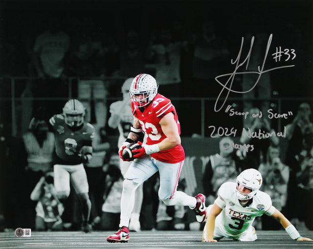 Celebrate the Ohio State Buckeyes' epic 2024 National Championship run with this stunning, collectible Autographed Horizontal Spotlight 16x20 Photo, personally signed by defensive standout Jack Sawyer. Featuring the inscription "Scoop & Score, 2024 National Champs", this premium photograph captures a moment every Buckeyes fan will remember forever. A must-have for Ohio State memorabilia collectors, this item is authenticated by Beckett Authentication Services (BAS) as part of their Witnessed Protection Program, guaranteeing authenticity and collector value for years to come.