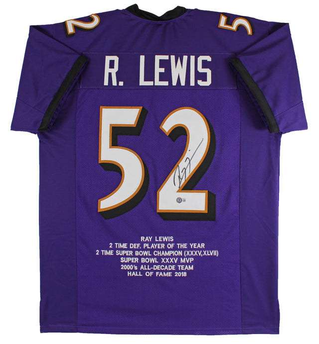 Own a piece of football history with this Ray Lewis Autographed Purple Pro Style Embroidered Stat Jersey, a must-have for any Baltimore Ravens fan or serious memorabilia collector. This eye-catching, X-Large, non-branded, custom-stitched jersey celebrates the legendary linebacker and his storied career. Authenticated by Beckett Authentication Services (BAS), this signed jersey ensures 100% authenticity with a tamper-proof hologram featuring a scannable QR code for verification.