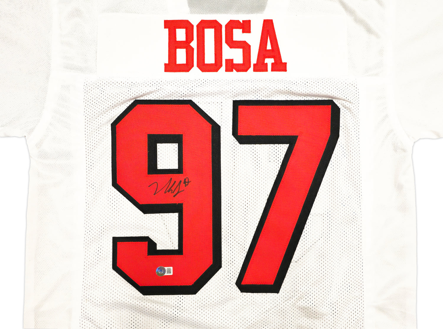 This Nick Bosa Autographed San Francisco 49ers White Jersey is a prized collectible for dedicated football fans and memorabilia enthusiasts. Signed by Nick Bosa, the star defensive lineman and 2019 NFL Defensive Rookie of the Year, this jersey is a standout piece celebrating one of the NFL’s elite defenders. Whether you’re a passionate San Francisco 49ers fan or a serious collector, this autographed jersey is a unique and valuable addition to your collection.