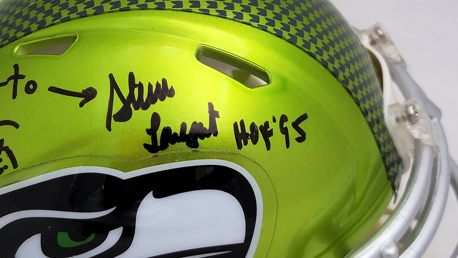 Steve Largent & Jim Zorn Autographed Seattle Seahawks Flash Green Speed Mini Helmet MCS Holo Stock #211062 is backordered and will ship as soon as it is back in stock.