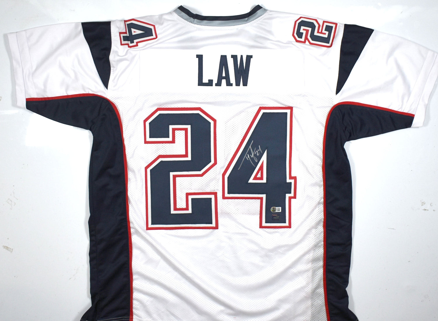 Ty Law Autographed White Pro Style Jersey - Beckett W Hologram *Silver *Up is backordered and will ship as soon as it is back in stock.