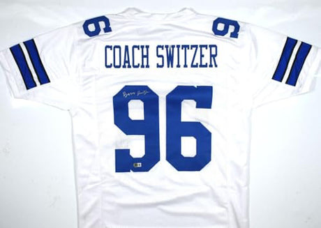 Barry Switzer Autographed White Pro Style STAT Jersey- Beckett W Hologram *Silv.