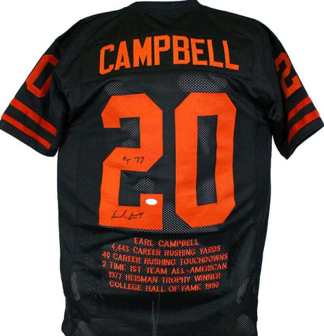 Earl Campbell Autographed Orange College Style Jersey STAT 4 w/ HT- JSA W *Black