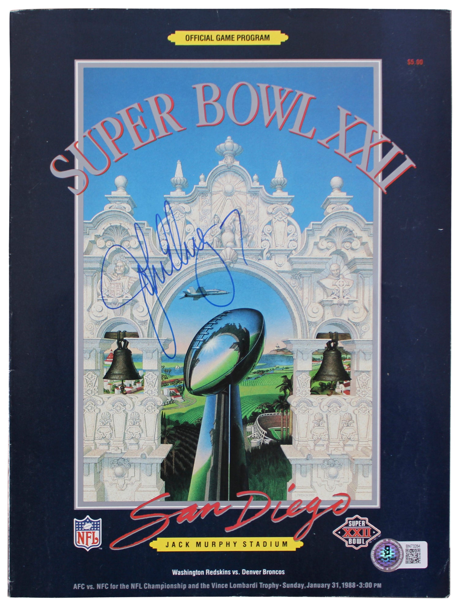 Own a piece of Super Bowl history with this Autographed Official Super Bowl XXII Program, personally signed by John Elway of the Denver Broncos. A must-have for football fans and collectors, this rare item commemorates one of the biggest events in NFL history.