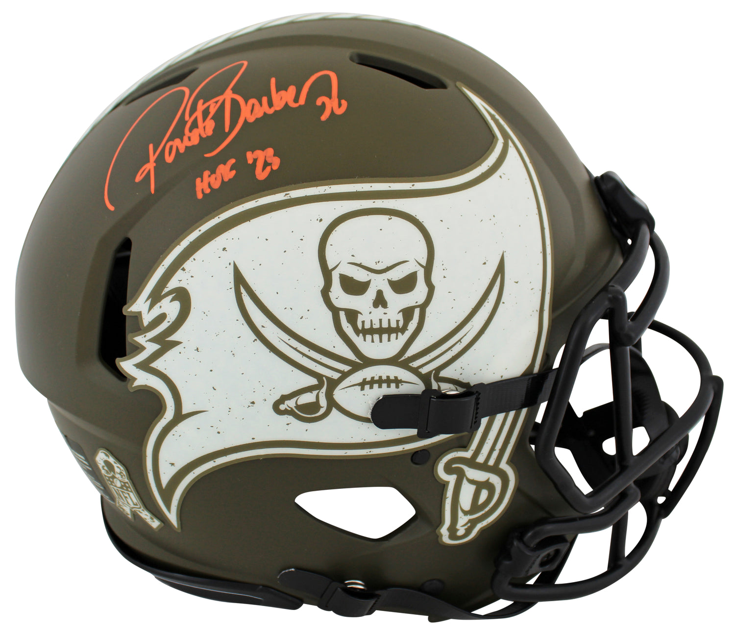 Own a piece of Tampa Bay Buccaneers history with this Ronde Barber Autographed Alternate Salute to Service Riddell Authentic Full-Size Speed Proline Helmet, featuring the exclusive inscription "HOF 23." A must-have for dedicated fans and collectors, this helmet celebrates Barber's legendary career and Hall of Fame induction.