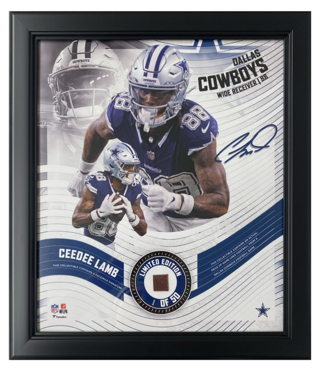 Showcase your passion for the Dallas Cowboys with this exclusive CeeDee Lamb Player Collage, a must-have for dedicated fans and memorabilia collectors. Perfect for displaying in your home, office, or fan cave, this collector’s piece captures the essence of one of the league’s most electrifying wide receivers. Limited to just 50 pieces, this edition is even more special as you will receive number "1" from the series.