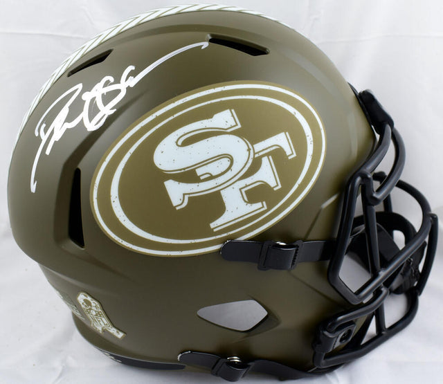 This Deion Sanders signed San Francisco 49ers Full-Size Salute to Service Speed Helmet is a must-have for any serious collector or fan of NFL history. Hand-signed by the legendary Hall of Famer, this autographed helmet not only commemorates Sanders' time with the San Francisco 49ers, but also honors the NFL’s Salute to Service initiative, which recognizes the contributions of U.S. military personnel. Why this signed Deion Sanders helmet stands out: