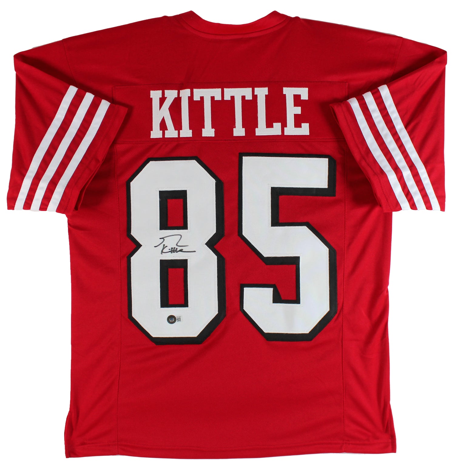 Own a piece of San Francisco 49ers history with this Autographed Red Pro Style Jersey, personally signed by George Kittle! Perfect for die-hard 49ers fans and serious sports memorabilia collectors, this jersey is 100% authentic, featuring a Beckett Authentication Services (BAS) hologram for verification.