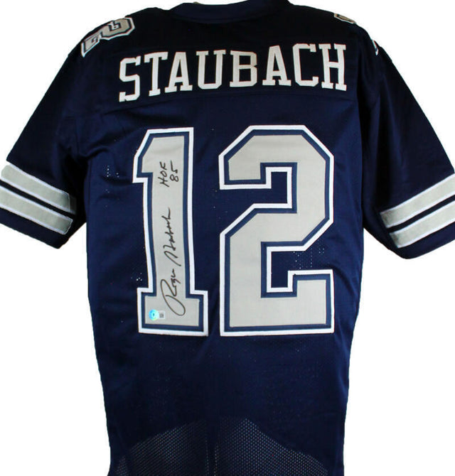 Own a piece of football history with this hand-signed Roger Staubach autographed jersey, complete with a Hall of Fame (HOF) inscription. This custom-made, authentic-style jersey features stitched letters and numbers, making it a must-have for collectors and devoted Dallas Cowboys fans.