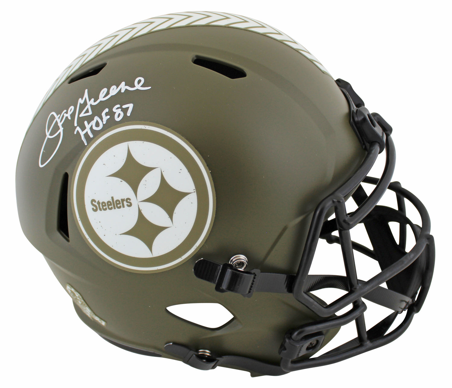 Own a piece of Pittsburgh Steelers history with this Autographed Alternate Salute to Service Riddell Full-Size Speed Replica Helmet, personally signed by legendary Hall of Famer Joe Greene with the exclusive inscription "HOF 87." This collectible is a must-have for devoted Steelers fans and memorabilia enthusiasts.