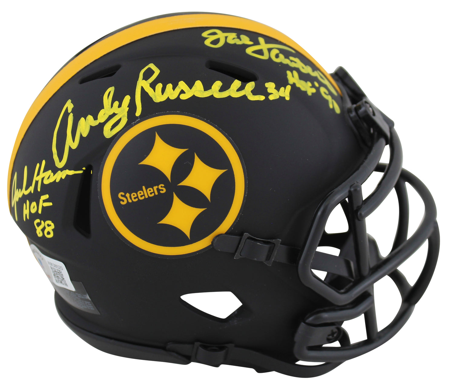 Own a piece of Pittsburgh Steelers history with this Autographed Alternate Eclipse Speed Mini Helmet, signed by legendary Steelers linebackers Jack Lambert, Jack Ham, and Andy Russell. This exclusive piece is inscribed with "2x SB Champs" (Russell), "HOF 88" (Ham), and "HOF 90" (Lambert), making it a must-have collectible for devoted Steelers fans and memorabilia collectors.