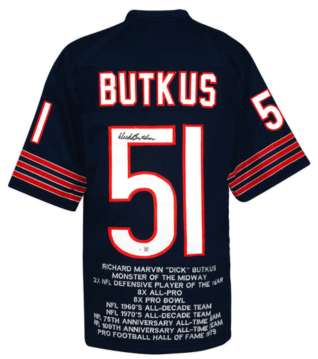 Dick Butkus Signed Navy Embroidered Stat Custom Football Jersey - (Beckett)