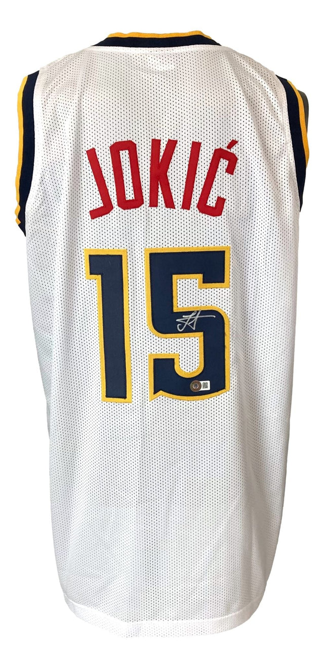 Celebrate the dominance of a modern NBA legend with this Nikola Jokic signed custom basketball jersey—a must-have collectible for fans of the two-time NBA MVP and 2023 NBA Champion. Known for his unmatched court vision and historic performances with the Denver Nuggets, Jokic has cemented his place as one of the greatest centers in basketball history. This custom jersey is a fantastic tribute to his legacy, perfect for display in any man cave, office, or memorabilia collection.