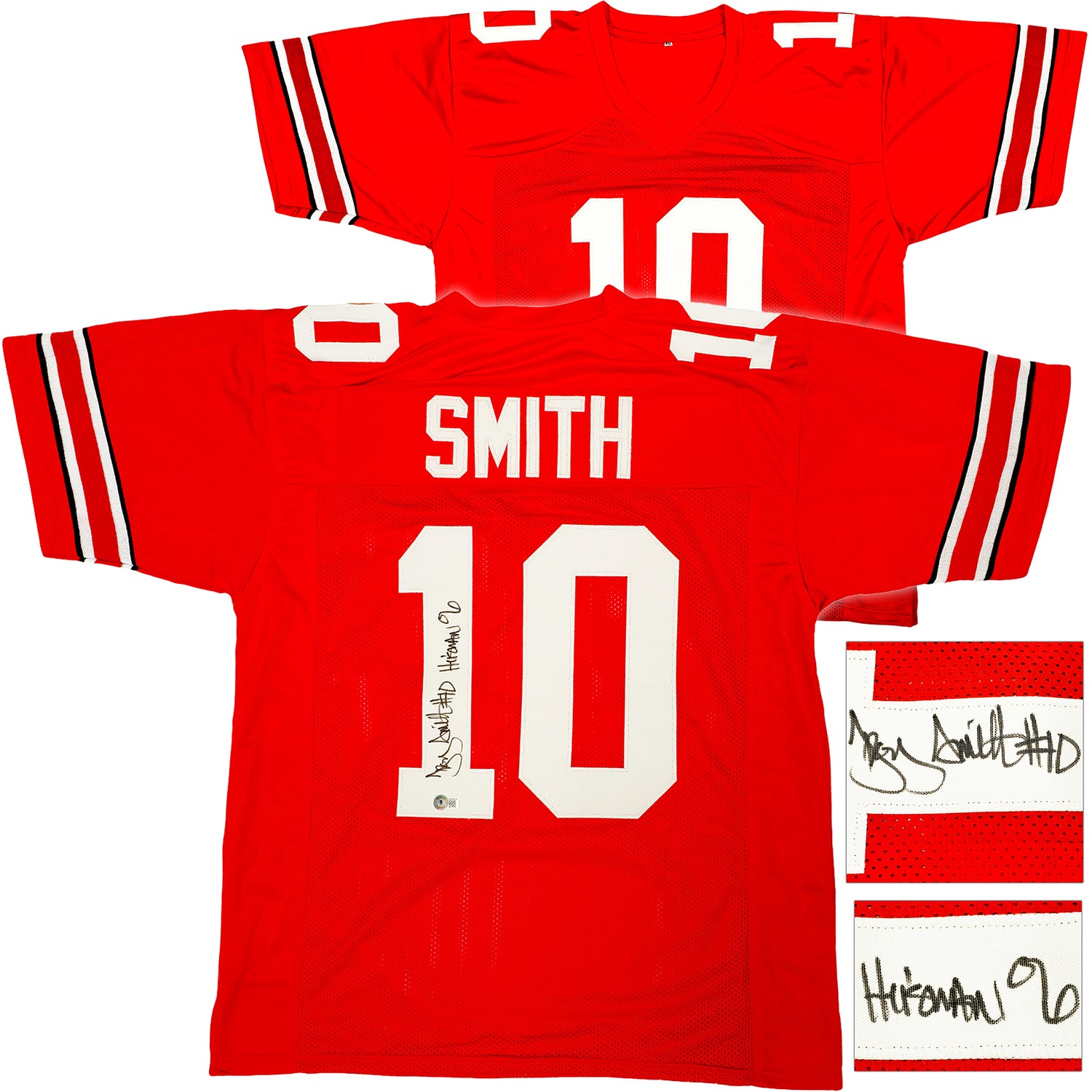 Own a piece of college football history with this Troy Smith Signed Red Jersey, inscribed with "Heisman 06" to commemorate his legendary 2006 Heisman Trophy-winning season. This custom jersey is a must-have for Ohio State Buckeyes fans and sports memorabilia collectors alike.
