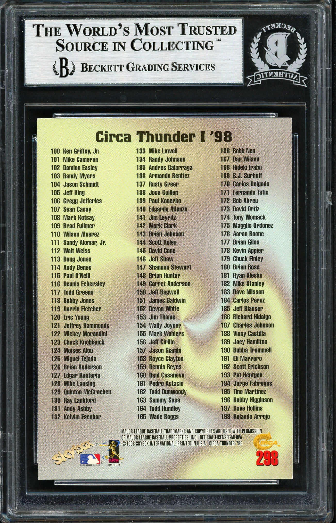 Own a piece of baseball history with this 1998 Skybox Circa Thunder Card #298, hand-signed by Alex Rodriguez. A standout collectible from one of the most electrifying players of his era, this autographed card is a must-have for serious sports memorabilia collectors and fans of A-Rod. Authenticated by Beckett Authentication Services (BAS), it comes encapsulated in a tamper-proof holder for long-term preservation and display.