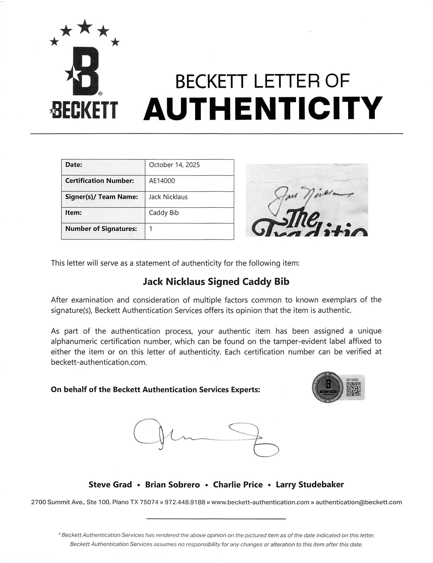 Jack Nicklaus Authentic Signed The Tradition Caddy Bib Shirt BAS #AE14000 is backordered and will ship as soon as it is back in stock.